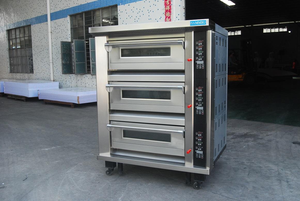 :如SK-633三层九盘烤箱,采用PID智能温控系统,温度波动控制在±1.5℃以内,配备蒸汽发生装置,可实现欧包、法棍等烘焙需求。